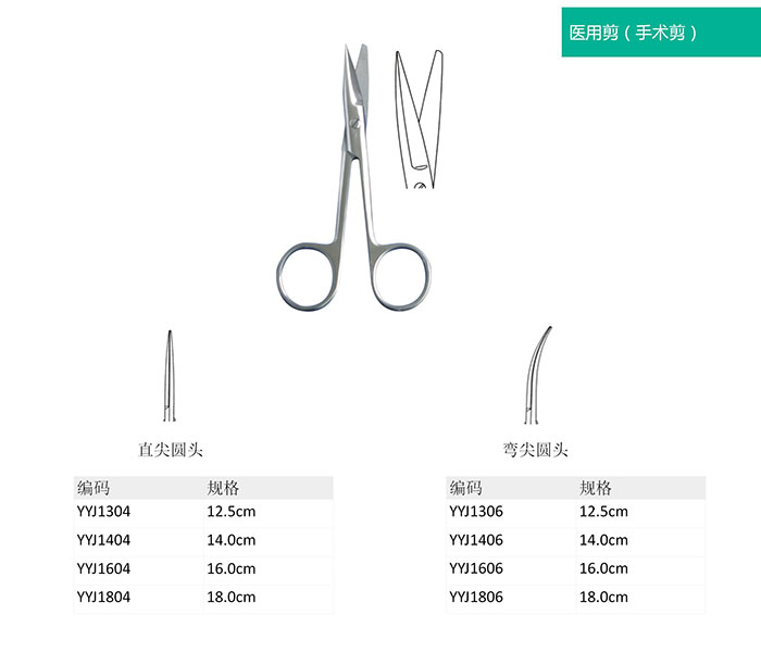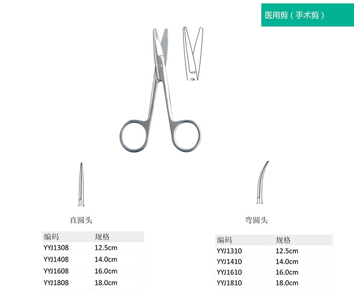 據(jù)其用途分為組織剪(Tissue Scissors)、線剪(Stitch Scissors)及拆線剪(Ligature Scissors)。分別有直尖頭,彎尖頭,直圓頭,彎圓頭12.5cm,14cm,16cm,18cm,20cm,22cm,24cm等。