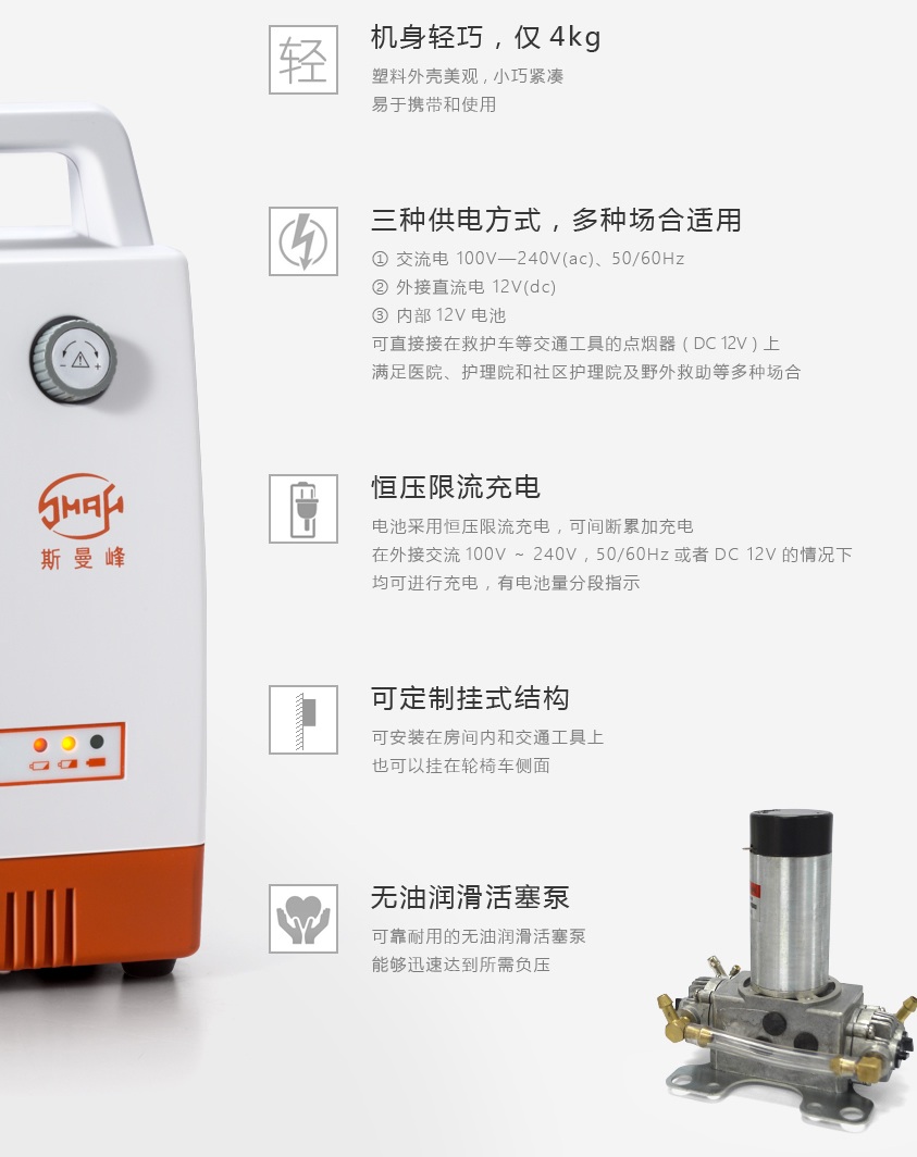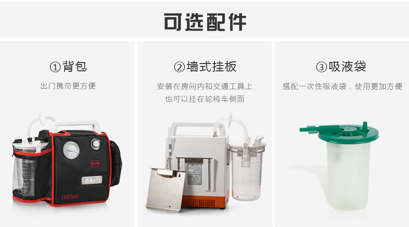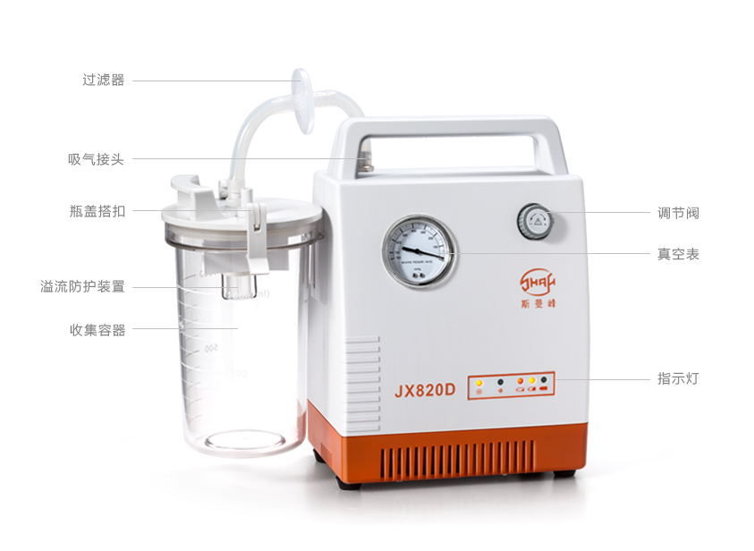 JX820D/JX820D-1便攜式吸引器是新一代交/直流兩用的高負(fù)壓高流量醫(yī)用吸引裝置。該產(chǎn)品供醫(yī)療機構(gòu)吸出患者上呼吸道中的分泌物,及手術(shù)中用于吸引患者各種滲出液、沖洗液,尤其適用于在交通工具上或患者轉(zhuǎn)運途中等缺少交流電源的情況下對病人實施搶救和護(hù)理。