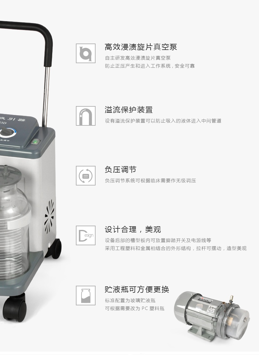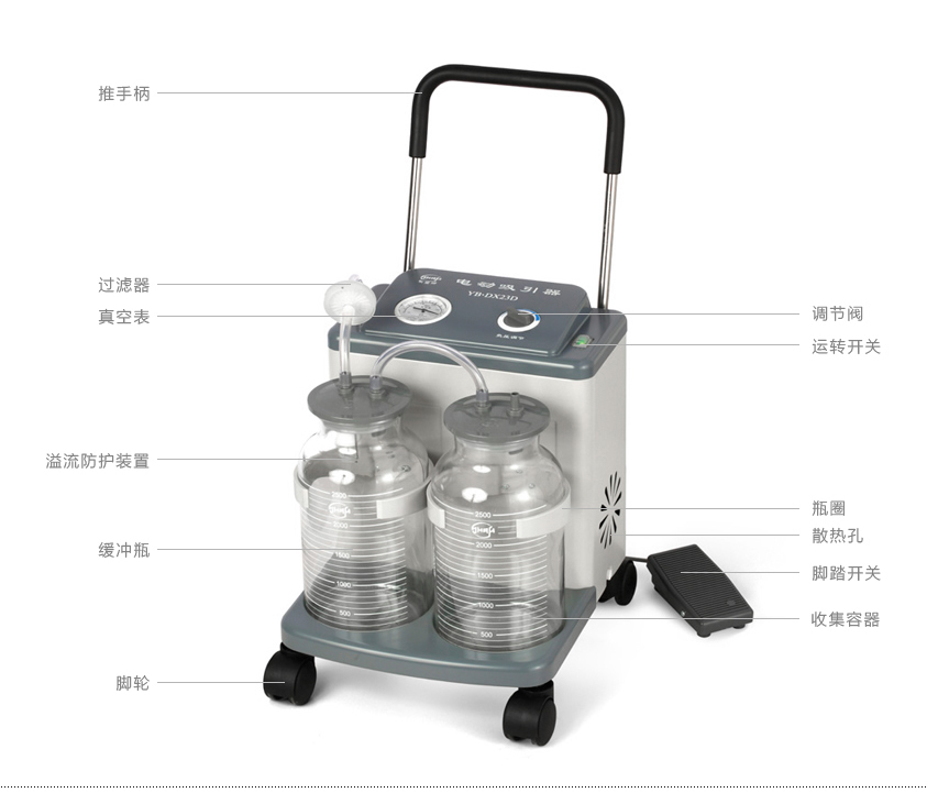 YB-DX23D型電動吸引器是一臺高負壓、大流量、移動式吸引裝置,供醫(yī)療機構(gòu)吸除患者氣道內(nèi)分泌物,手術(shù)室內(nèi)吸除患者體內(nèi)滲出液和沖洗液。產(chǎn)品不適用于流產(chǎn)吸引。注冊證號:滬械注準20152540795