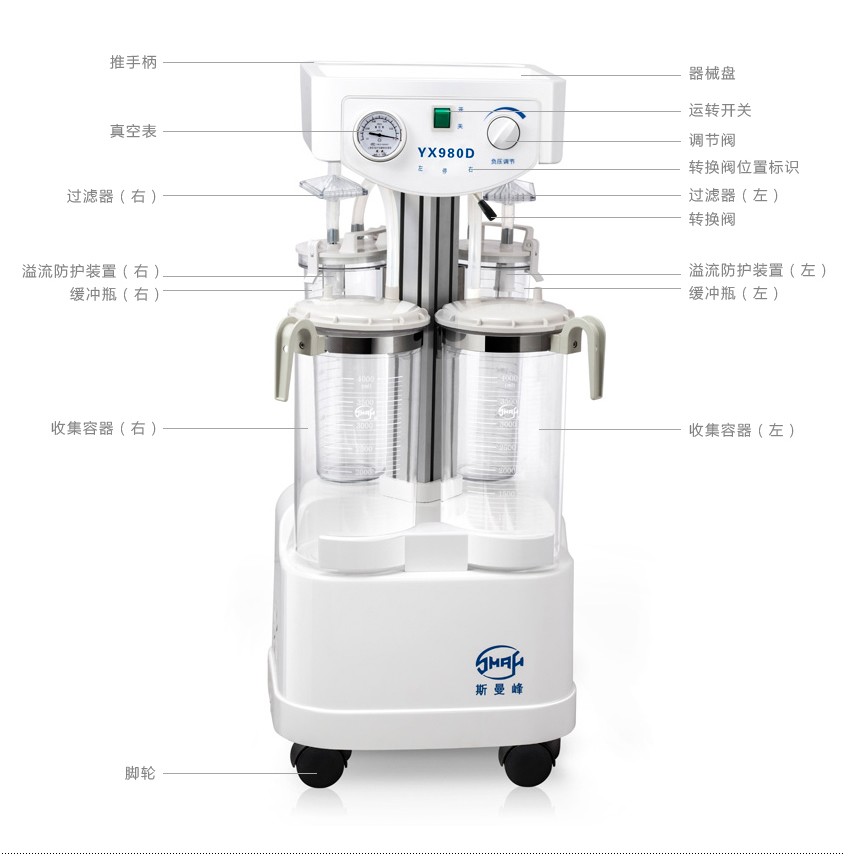 YX980D型電動吸引器是一種高負(fù)壓、大流量的醫(yī)用吸引裝置。該產(chǎn)品適用于醫(yī)療機(jī)構(gòu)吸出患者氣道內(nèi)分泌物,手術(shù)時吸除患者體內(nèi)滲出液和沖洗液。不適用于流產(chǎn)吸引。 注冊證號: 滬食藥監(jiān)械(準(zhǔn))字2014第2540396號(更)