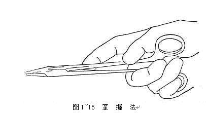 2.指套法,為傳統(tǒng)執(zhí)法。用拇指、無名指套入鉗環(huán)內(nèi),以手指活動力量來控制持針鉗的開閉,并控制其張開與合擾時的動作范圍。用中指套入鉗環(huán)內(nèi)的執(zhí)鉗法,因距支點遠而穩(wěn)定性差,故為是錯誤的執(zhí)法。