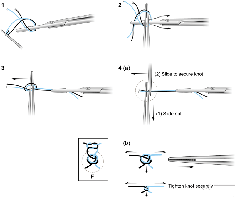 4,持針鉗繞線方法:將持針器(血管鉗)置于上方線和下方線之間,然后將下方線向上繞鉗一圈(兩圈為外科結(jié)),用持針器(血管鉗)夾住上方線頭通過圈內(nèi)向下拉,拉緊,為第一個結(jié)。將持針器(血管鉗)置于兩線之間,將上方線(即上一步下方線)向下繞鉗一圈,用持針器(血管鉗)夾住下方線頭